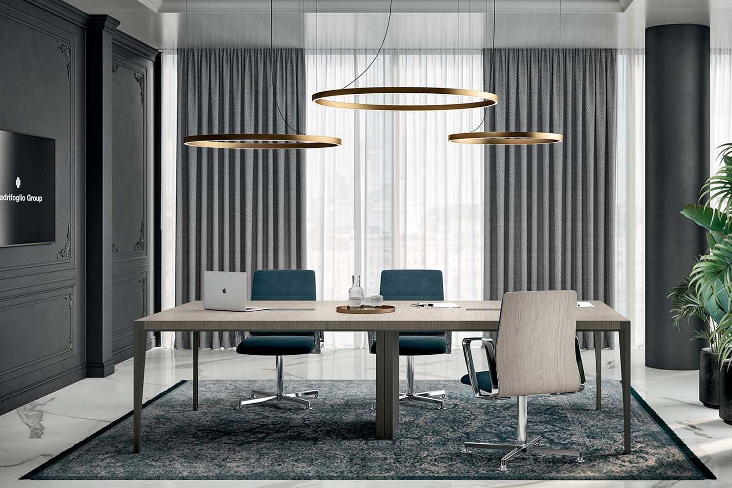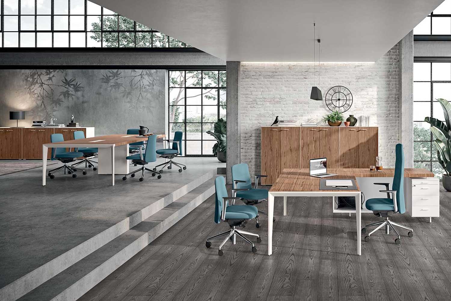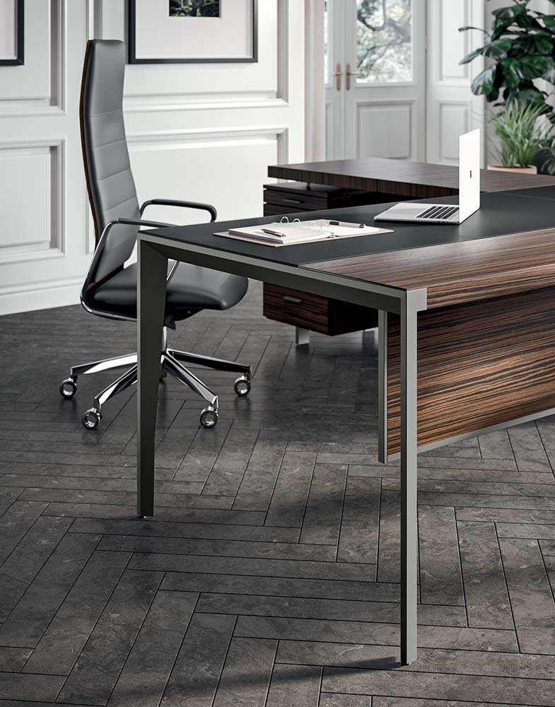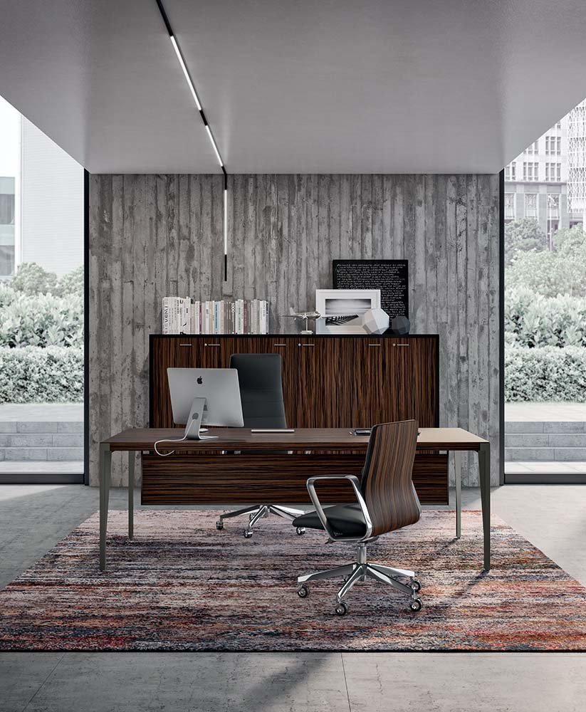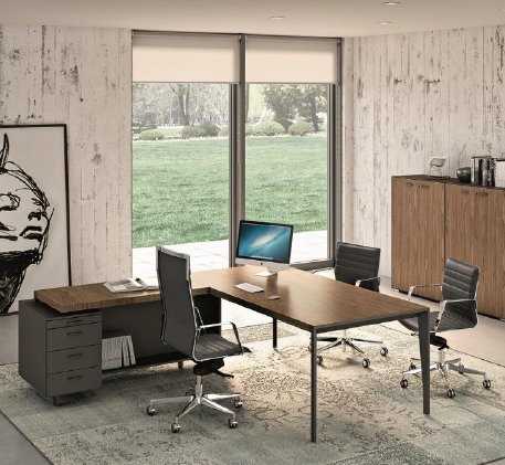 Sobres de la mesa y ala en chapa de madera precompuesta, Armario diáfano y buc lacados, estructura metálica de diseñoX9